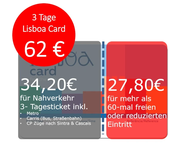 - Die Lisboa Card mit einer Gültigkeit von 72h (3 Tagen) kostet 62 €.